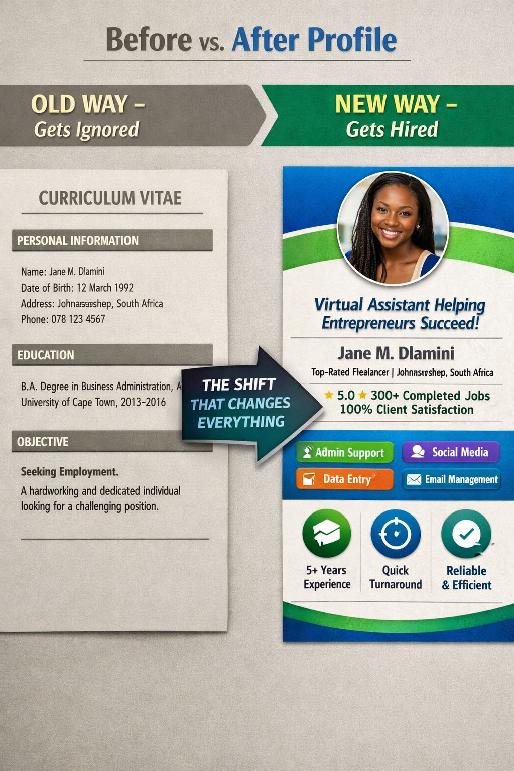 A business owner in London doesn't care that you went to Thuto-Pele High School or got a distinction in Life Orientation. A startup founder in Austin, Texas has no idea what "matric" means. A European entrepreneur hiring a virtual assistant doesn't want your life story.